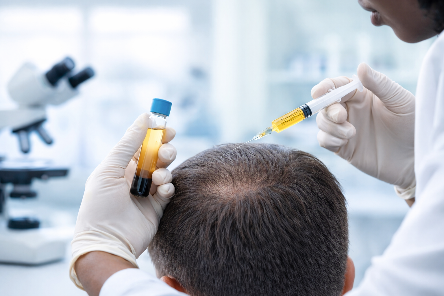GFC uses your own blood that is processed and re-introduced under physician supervision. The use of platelet-derived growth factors for hair restoration is considered an off-label, regenerative application, and while studies are promising, it is not FDA-approved as a formal “cure” for hair loss.