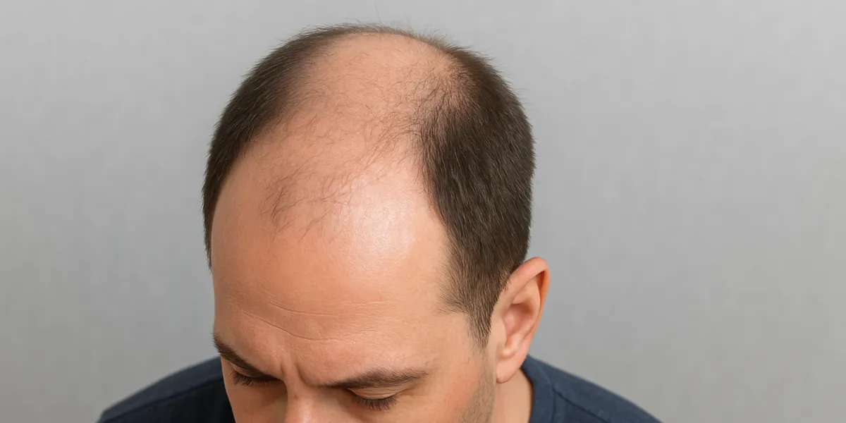 Hereditary pattern baldness affecting men and women. The most common form of hair loss.
