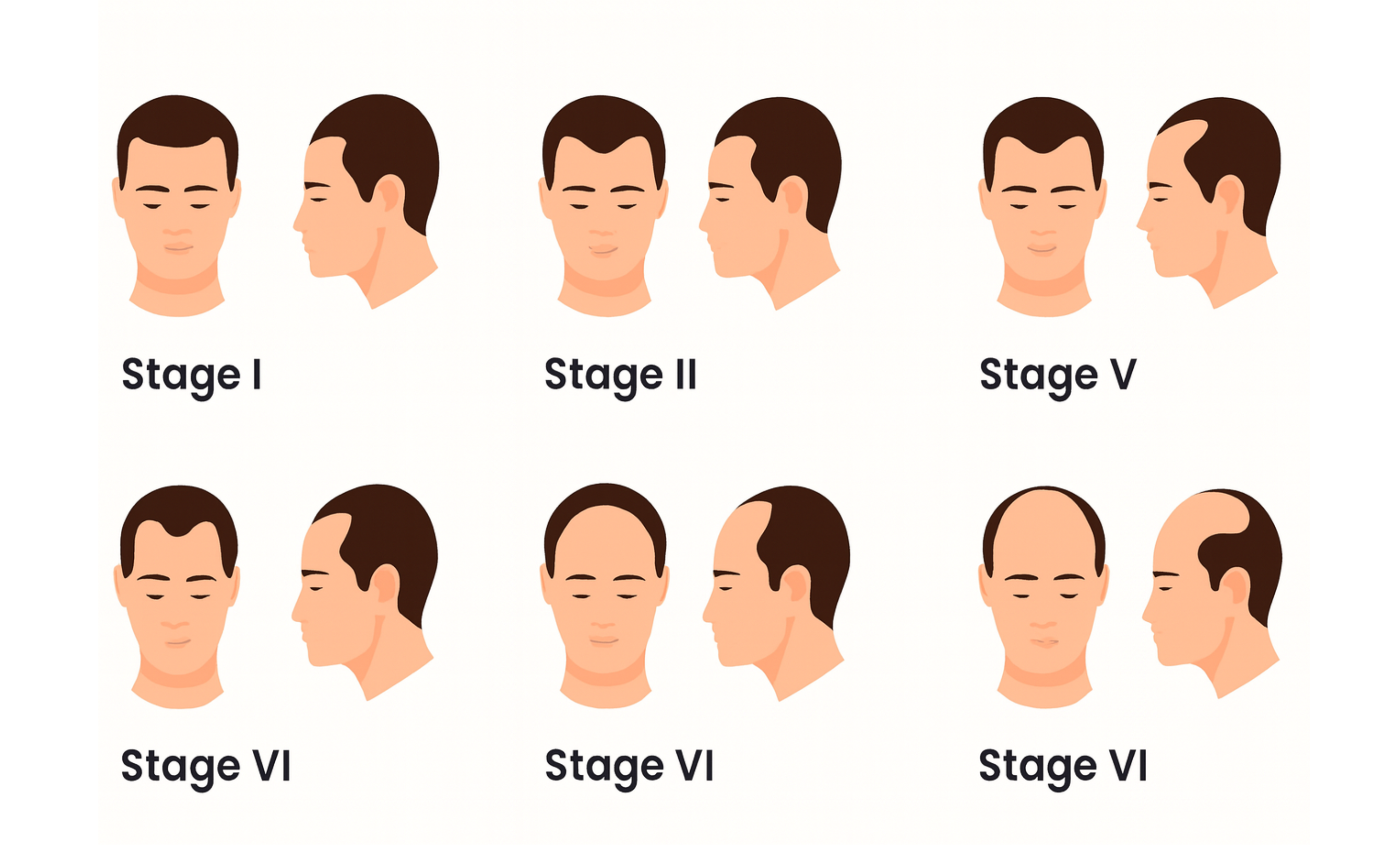 This system breaks down hair loss into seven distinct stages, ranging from minimal recession to advanced hair thinning across the crown and hairline.